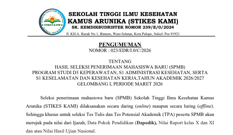 📢 Pengumuman Resmi Hasil Seleksi PMB Gel. 1 2026/2027